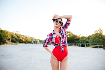 若い可愛いサングラスと赤い水着オープン道路屋外でポーズのブルネットの少女 の写真素材 画像素材 Image